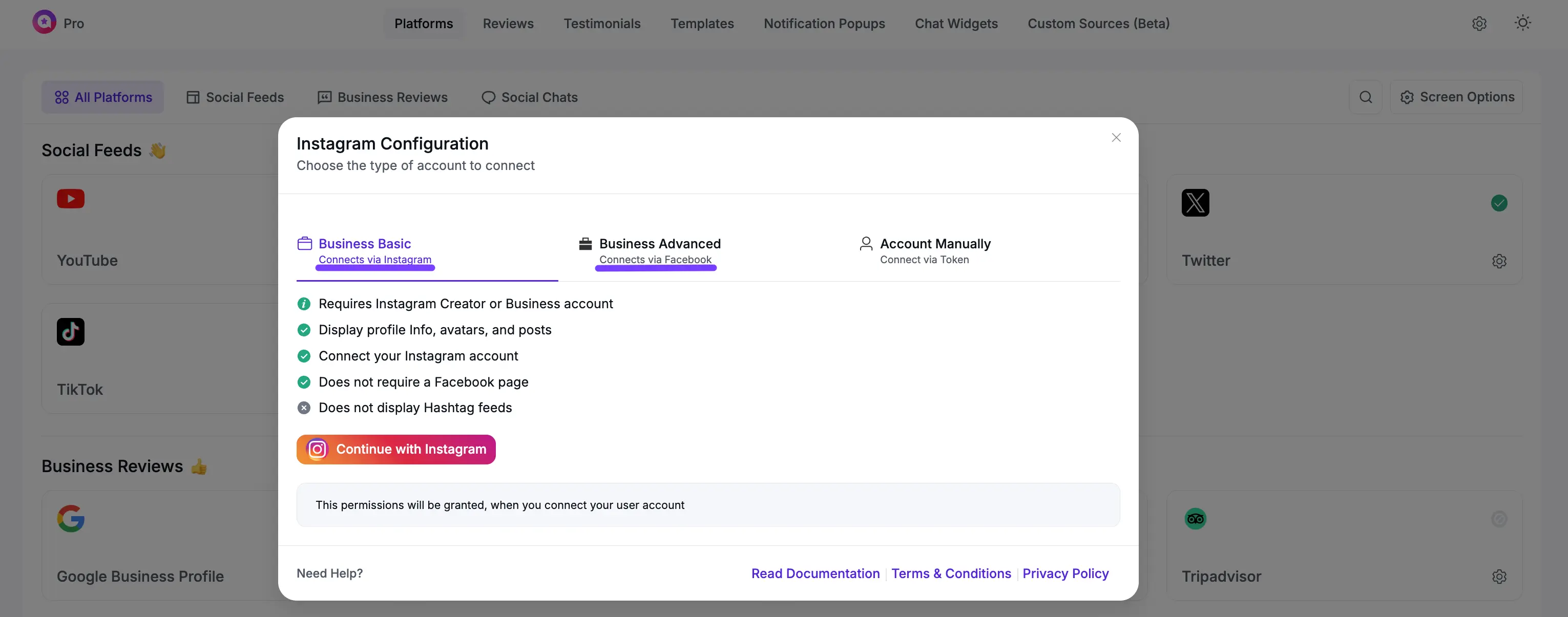 Business Basic Account: Choosing this connection is ideal for a simple setup that shows posts from a single Instagram account.