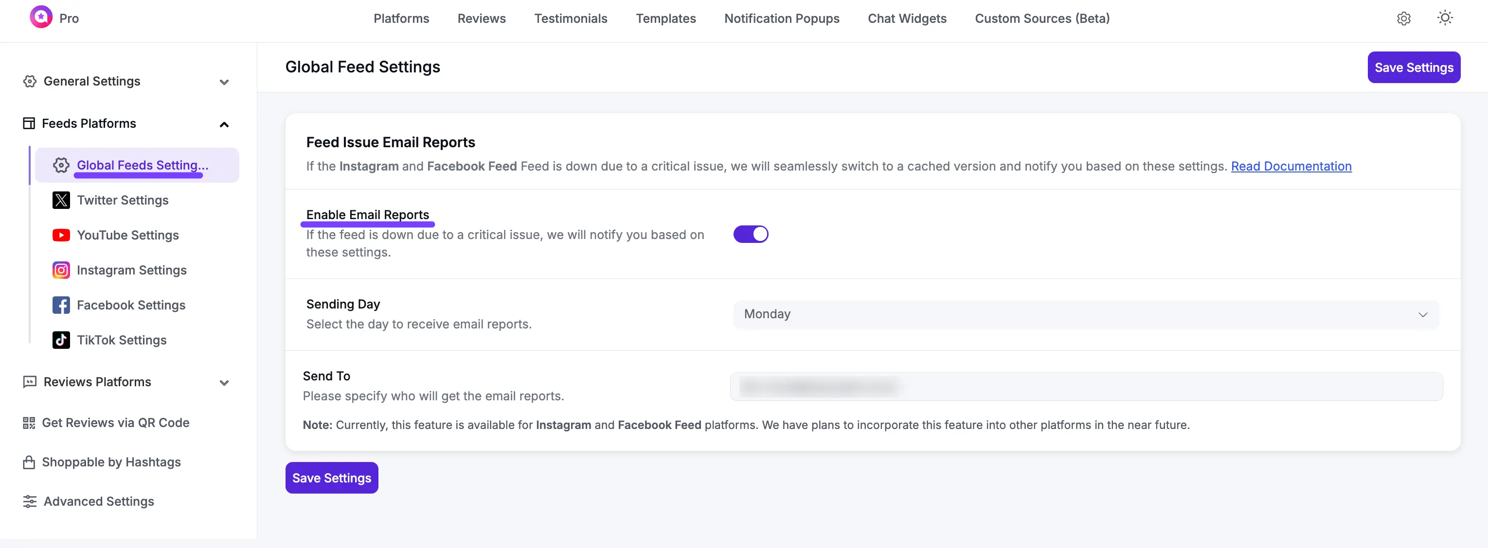 Access the Settings of your WP Social Ninja dashboard. Now go to Advanced Settings and you will find the "Feed Issue Email Report" feature toggle to enable it.